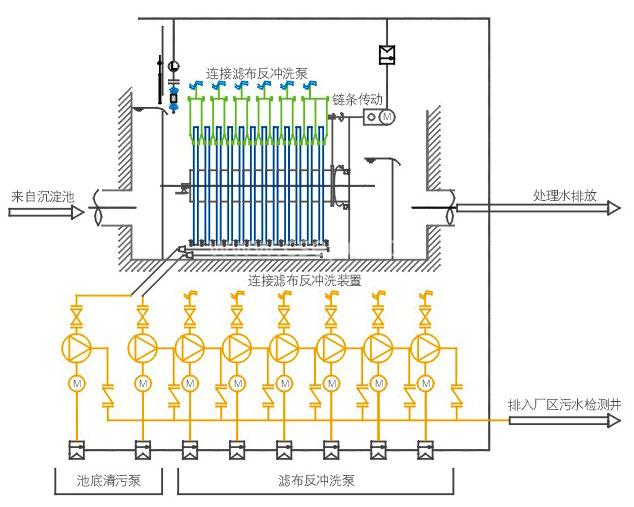 過濾——待濾水首先由進水渠進入濾布濾池,水流在壓力作用下從濾盤兩側由外向內地通過濾布進行過濾,濾 后水匯集到中心管,通過中心管流到出水渠,最后通過出水堰溢入出水口。