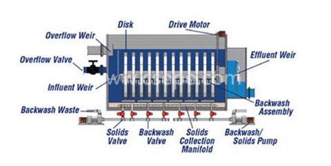 濾布:濾毛的深度儲存俘獲的粒子,減少正常運行時的水頭損失。每個濾布濾盤浸沒在水中,且容易從裝置上取出。